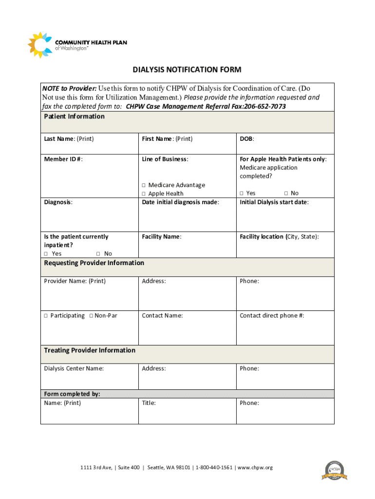 DIALYSIS NOTIFICATION FORMNOTE to Provider: Use this form to notify CHPW of Dialysis for Coordination of Care. (Do Not use this form for Utilization Management.) Please provide the information requested