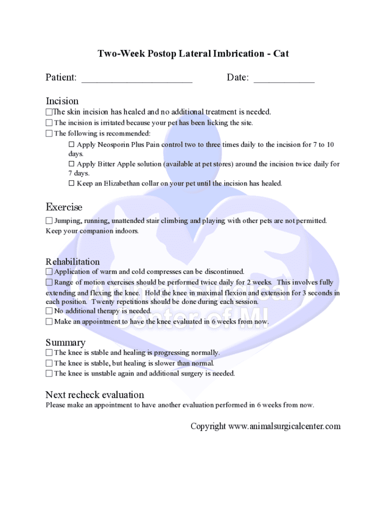 TwoWeek Postop Lateral Imbrication Cat Patient: ___Date: ___Incision Theskin incision has healed and no additional treatment is needed. The incision is irritated because your pet has been licking