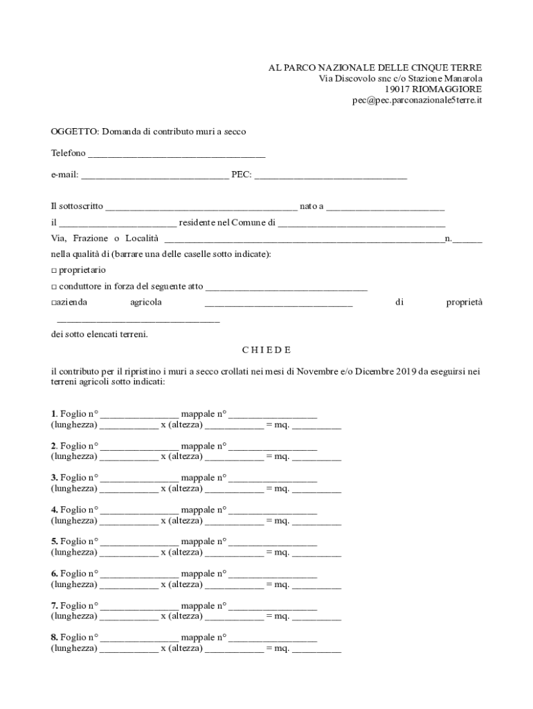 AL PARCO NAZIONALE DELLE CINQUE TERRE Via Discovolo snc c/o Stazione Manarola 19017 RIOMAGGIORE pec@pec.parconazionale5terre.it OGGETTO: Domanda di contributo muri a secco Telefono ___ email: ___