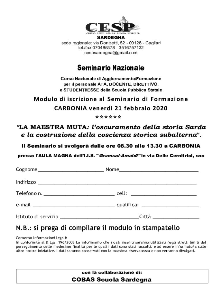 SARDEGNA sede regionale: via Donizetti, 52 09128 Cagliari tel./fax 070485378 3516757132 cespsardegna@gmail.comSeminario Nazionale Corso Nazionale di Aggiornamento/Formazione per il personale ATA,