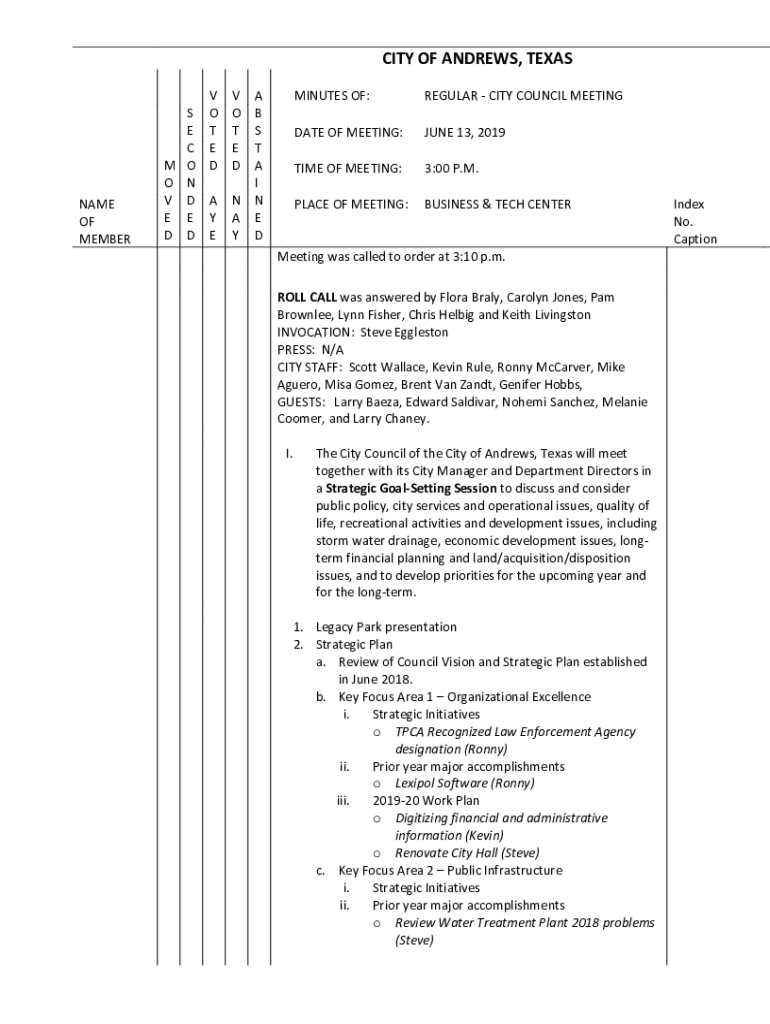 CITY OF ANDREWS, TEXASNAME OF MEMBERS E C M O O N V D E E D DV O T E D A Y EV O T E DA B S T A I N N A E Y DMINUTES OF:REGULAR CITY COUNCIL MEETINGDATE OF MEETING:JUNE 13, 2019TIME OF MEETING:3:00