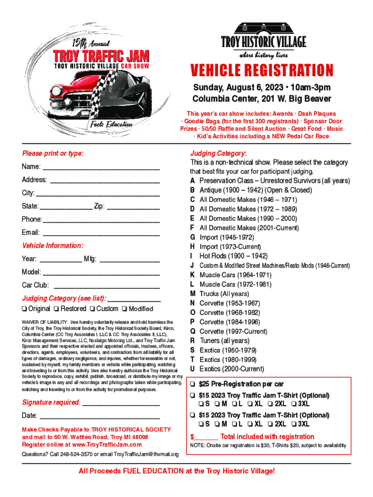 VEHICLE REGISTRATION Sunday, August 6, 2023 10am3pm Columbia Center, 201 W. Big BeaverThis years car show includes: Awards Dash Plaques Goodie Bags (for the first 300 registrants) Sponsor Door Prizes