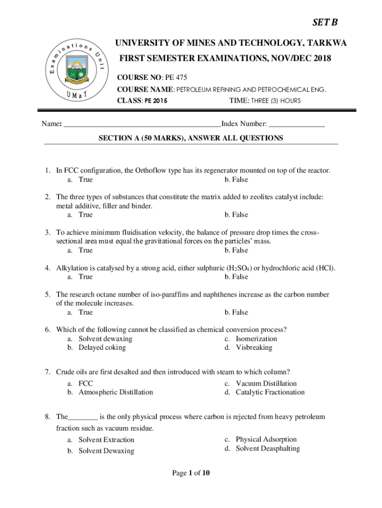 SET B UNIVERSITY OF MINES AND TECHNOLOGY, TARKWA FIRST SEMESTER EXAMINATIONS, NOV/DEC 2018 COURSE NO: PE 475 COURSE NAME: PETROLEUM REFINING AND PETROCHEMICAL ENG. CLASS: PE 2015 TIME: THREE (3) HOURS