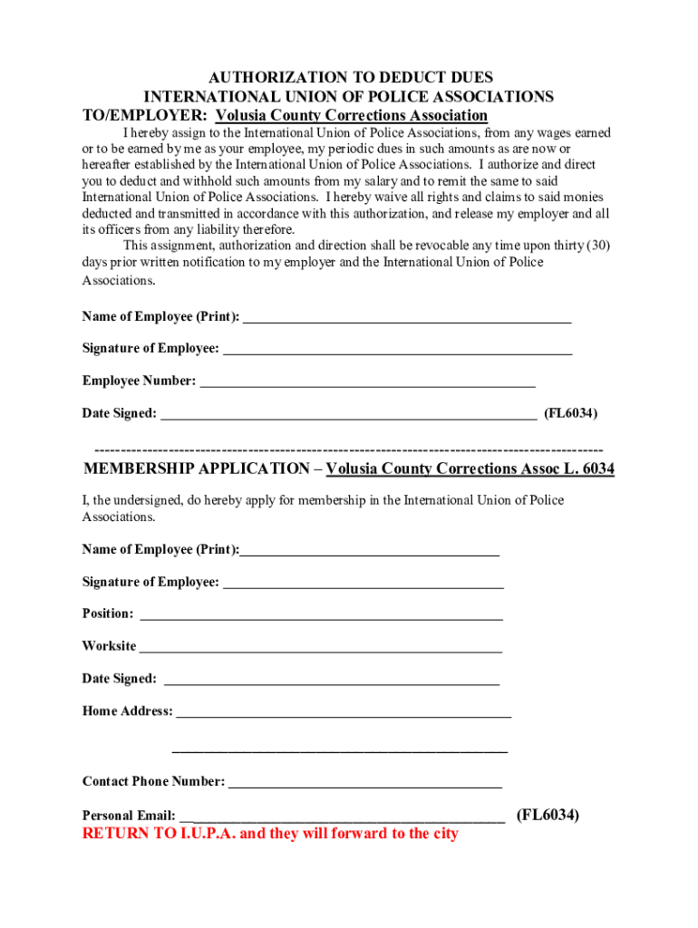 AUTHORIZATION TO DEDUCT DUES INTERNATIONAL UNION OF POLICE ASSOCIATIONS TO/EMPLOYER: Volusia County Corrections AssociationI hereby assign to the International Union of Police Associations, from any