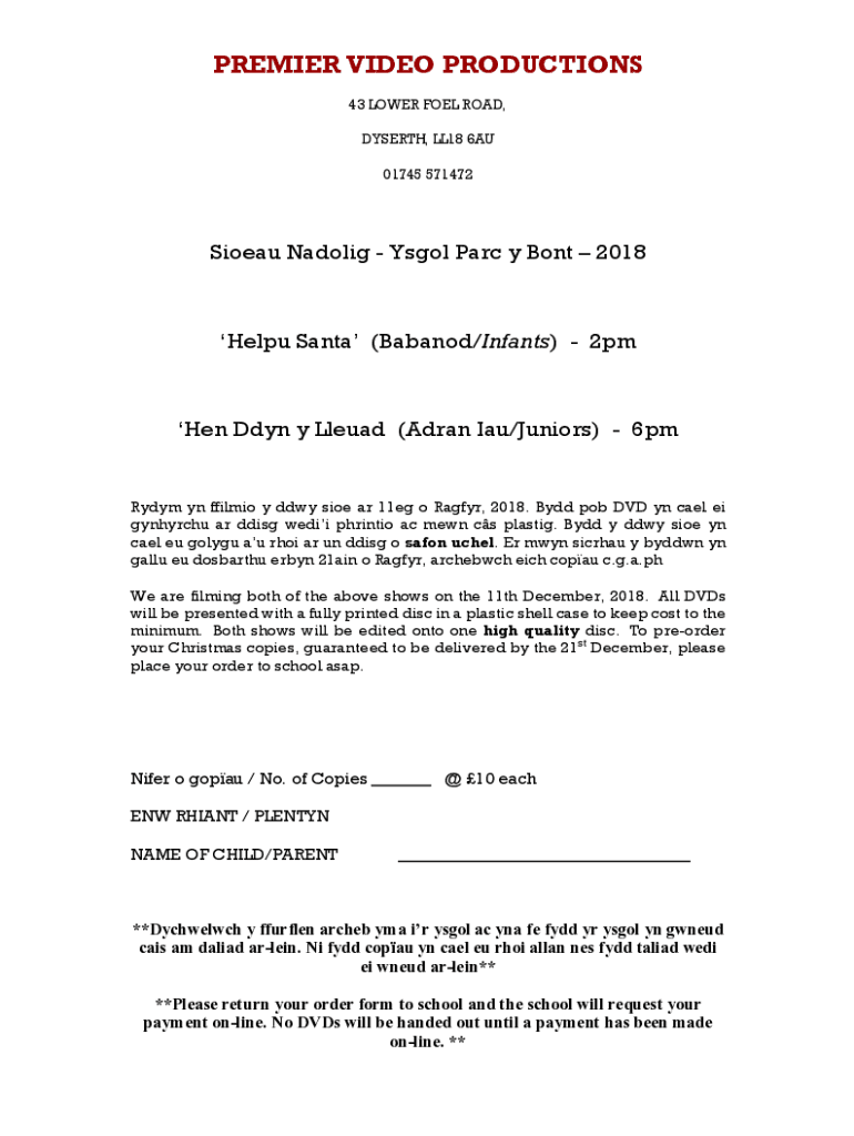 PREMIER VIDEO PRODUCTIONS 43 LOWER FOEL ROAD, DYSERTH, LL18 6AU 01745 571472Sioeau Nadolig Ysgol Parc y Bont 2018Helpu Santa (Babanod/Infants) 2pmHen Ddyn y Lleuad (Adran Iau/Juniors) 6pmRydym yn
