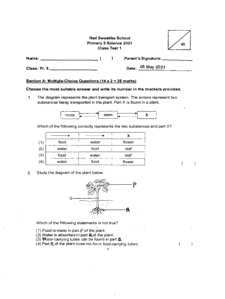 Red Swastika School Primary 5 Science 2021 Class Test 1 Name: ___ ( Class: Pr.Parent\'s Signature: ___)Date: 05 May 2021s ___Section A: MultipleChoice Questions (14 x 2 28 marks) Choose the most suitable
