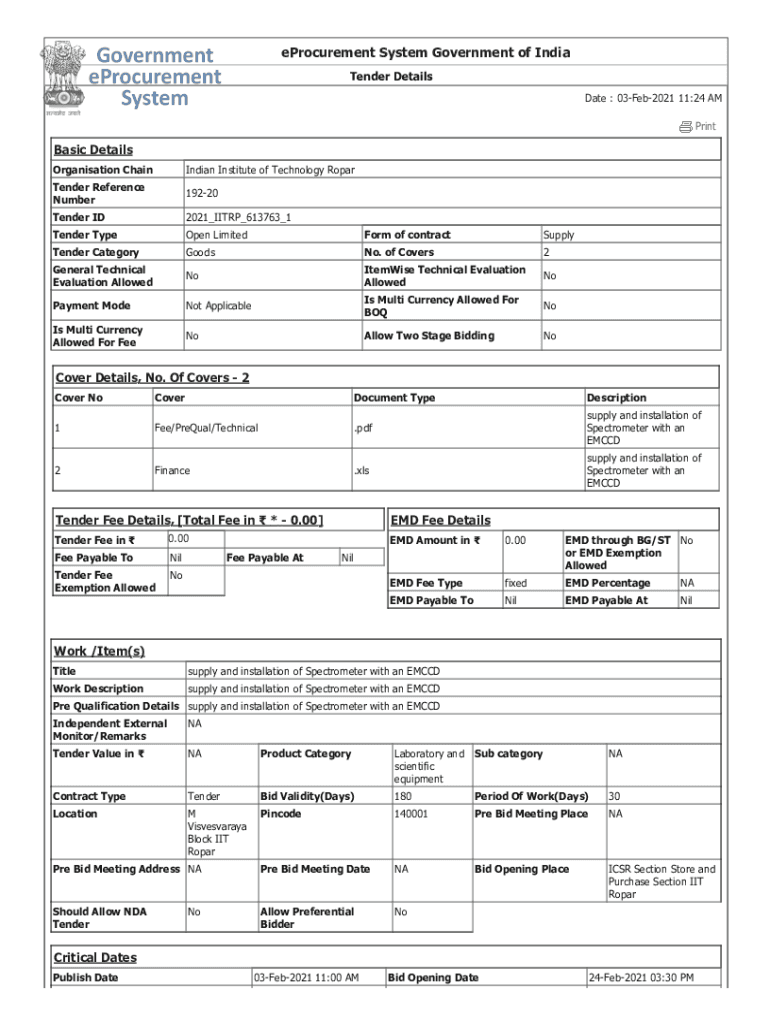 eProcurement System Government of India Tender Details Date : 03Feb2021 11:24 AM PrintBasic Details Organisation ChainIndian Institute of Technology RoparTender Reference Number19220Tender ID2021_IITRP_613763_1Tender
