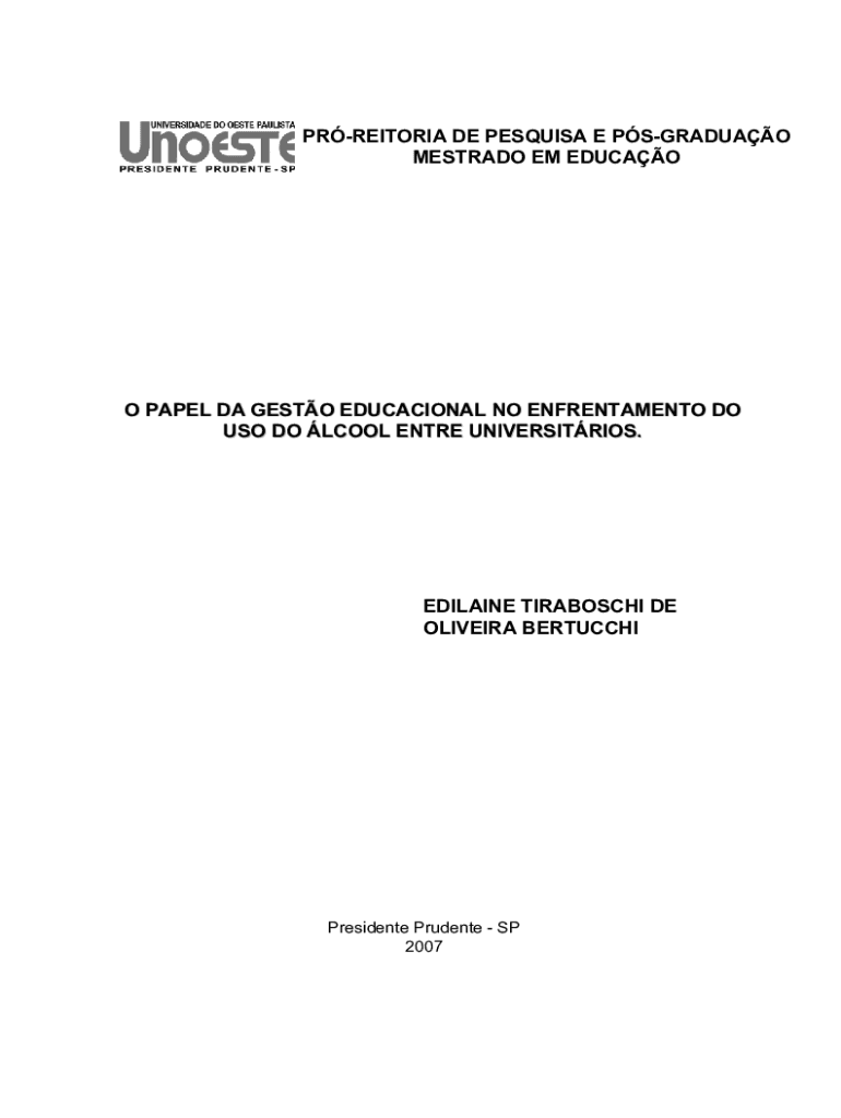 PRREITORIA DE PESQUISA E PSGRADUAO MESTRADO EM EDUCAOO PAPEL DA GESTO EDUCACIONAL NO ENFRENTAMENTO DO USO DO LCOOL ENTRE UNIVERSITRIOS.EDILAINE TIRABOSCHI DE OLIVEIRA BERTUCCHIPresidente Prudente