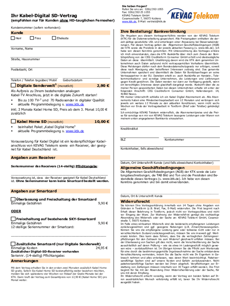 Ihr KabelDigital SDVertrag (empfohlen nur fr Kunden ohne HDtauglichen Fernseher)Sie haben Fragen? Rufen Sie uns an: 0261/3921955 Fax: 0261/39225 1055 KEVAG Telekom GmbH Cusanusstrae 7, 56073 Koblenz