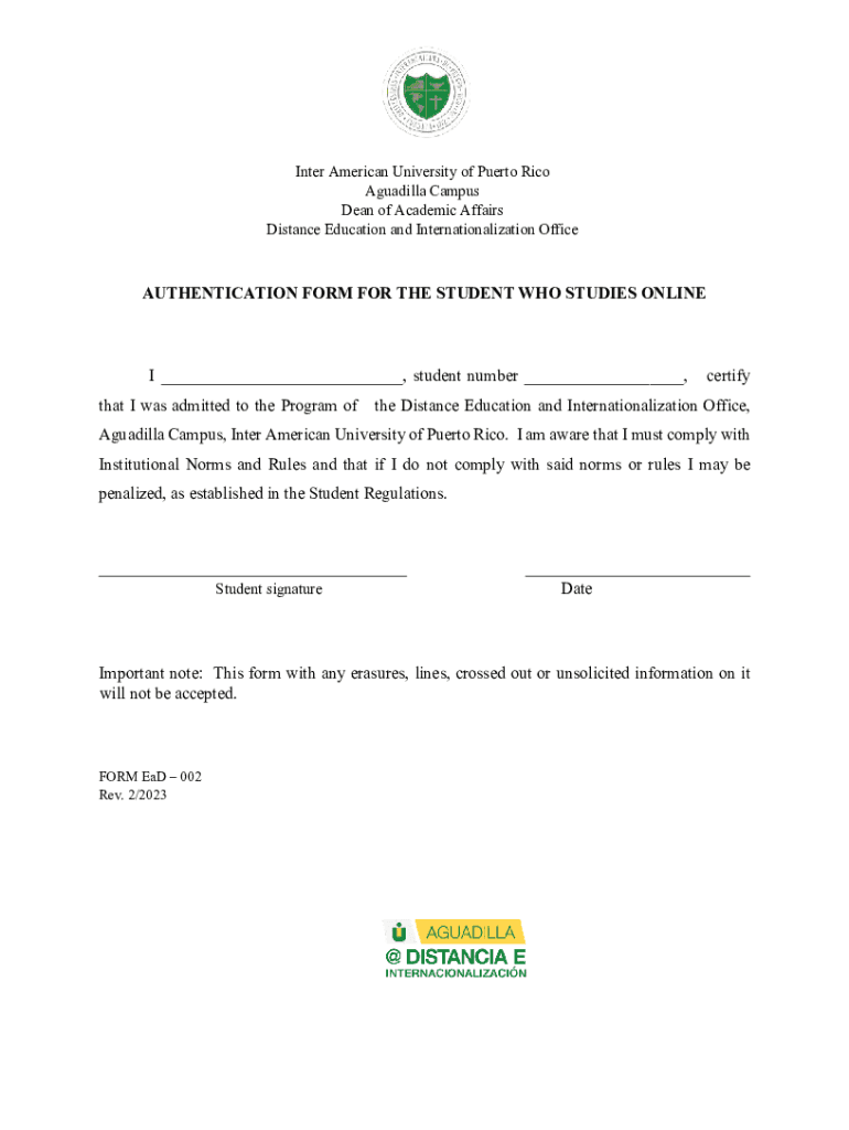 Inter American University of Puerto Rico Aguadilla Campus Dean of Academic Affairs Distance Education and Internationalization OfficeAUTHENTICATION FORM FOR THE STUDENT WHO STUDIES ONLINEI ___, student