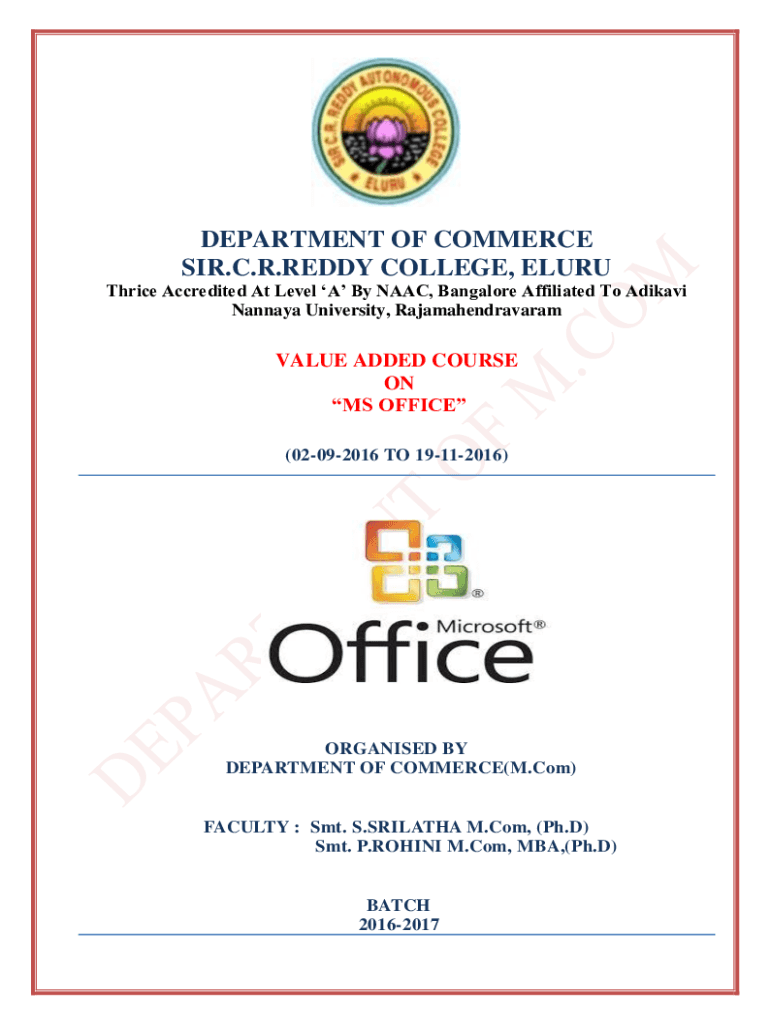 DEPARTMENT OF COMMERCE SIR.C.R.REDDY COLLEGE, ELURU Thrice Accredited At Level A By NAAC, Bangalore Affiliated To Adikavi Nannaya University, RajamahendravaramVALUE ADDED COURSE ON MS OFFICE (02092016