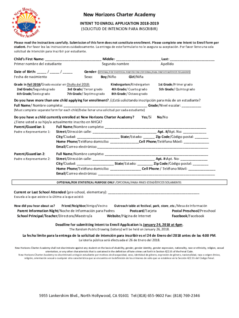 New Horizons Charter AcademyINTENT TO ENROLL APPLICATION 20182019(SOLICITUD DE INTENCION PARA INSCRIBIR)Please read the instructions carefully. Submission of this form does not constitute enrollment.