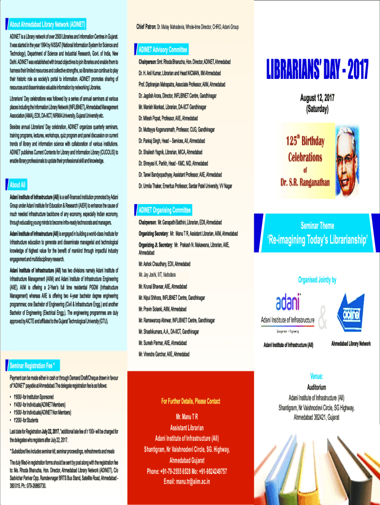 Chief Patron: Dr. Malay Mahadevia, Wholetime Director, CHRO, Adani GroupMr. Jay Joshi, IIIT, VadodaraMr. Manu TR Mr. Manu TR Assistant Librarian Assistant Librarian Adani Institute of Infrastructure