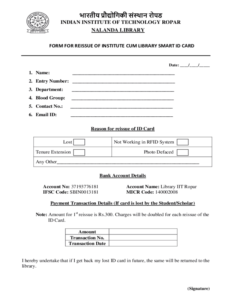 FORM FOR REISSUE OF INSTITUTE CUM LIBRARY SMART ID CARDDate: ___/___/___1. Name:___2. Entry Number: ___