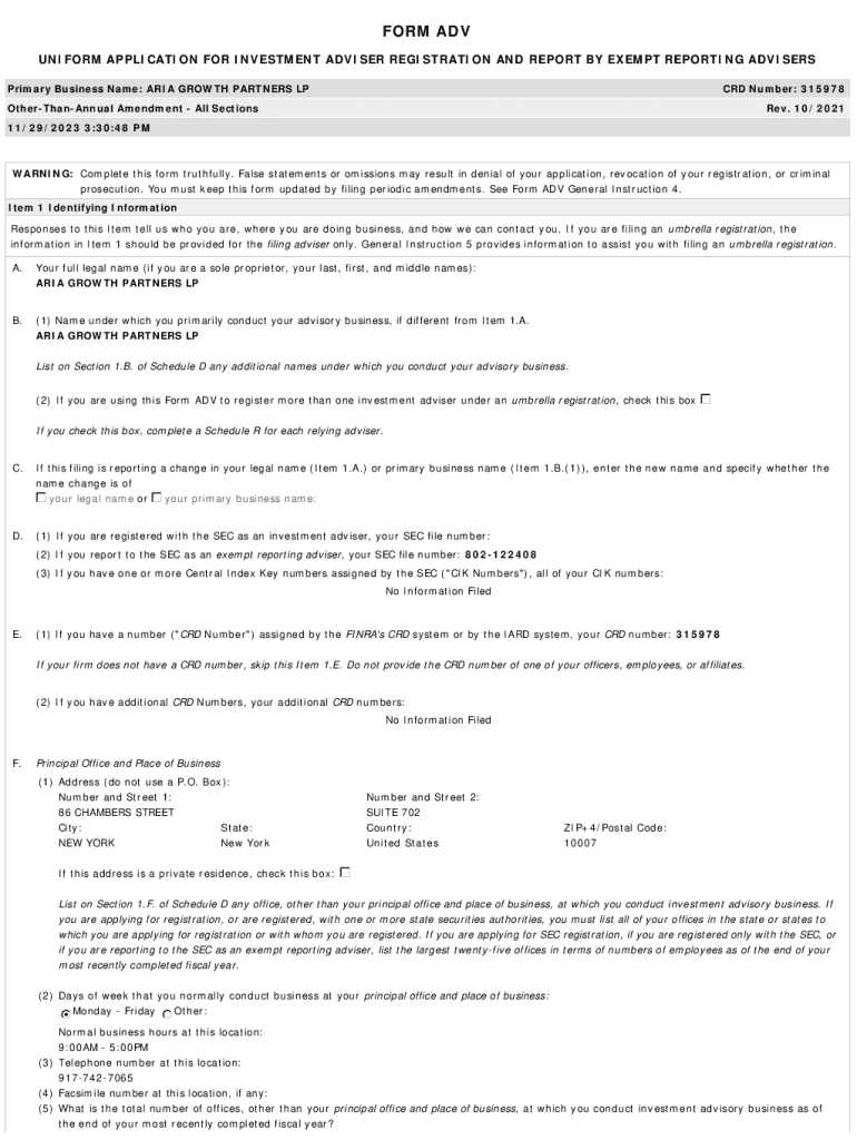 FORM ADV UNIFORM APPLICATION FOR INVESTMENT ADVISER REGISTRATION AND REPORT BY EXEMPT REPORTING ADVISERS Primary Business Name: ARIA GROWTH PARTNERS PCRD Number: 315978OtherThanAnnual Amendment All