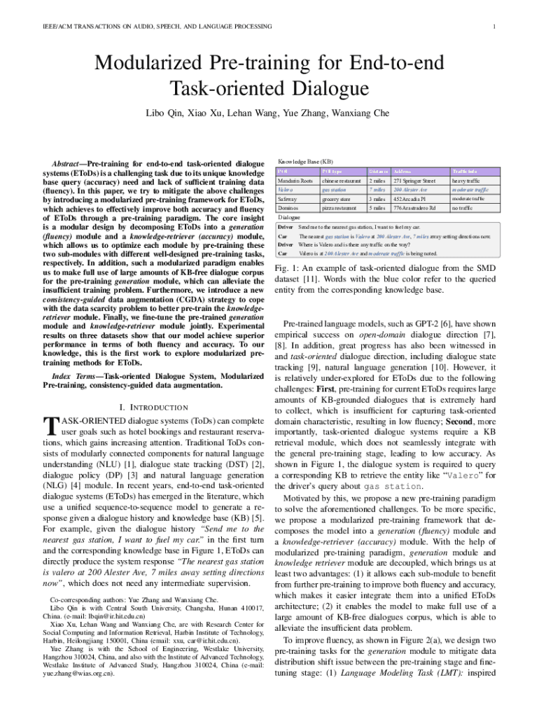IEEE/ACM TRANSACTIONS ON AUDIO, SPEECH, AND LANGUAGE PROCESSING1Modularized Pretraining for Endtoend Taskoriented Dialogue 12.21Libo Qin, Xiao Xu, Lehan Wang, Yue Zhang, Wanxiang CheAbstractPretraining