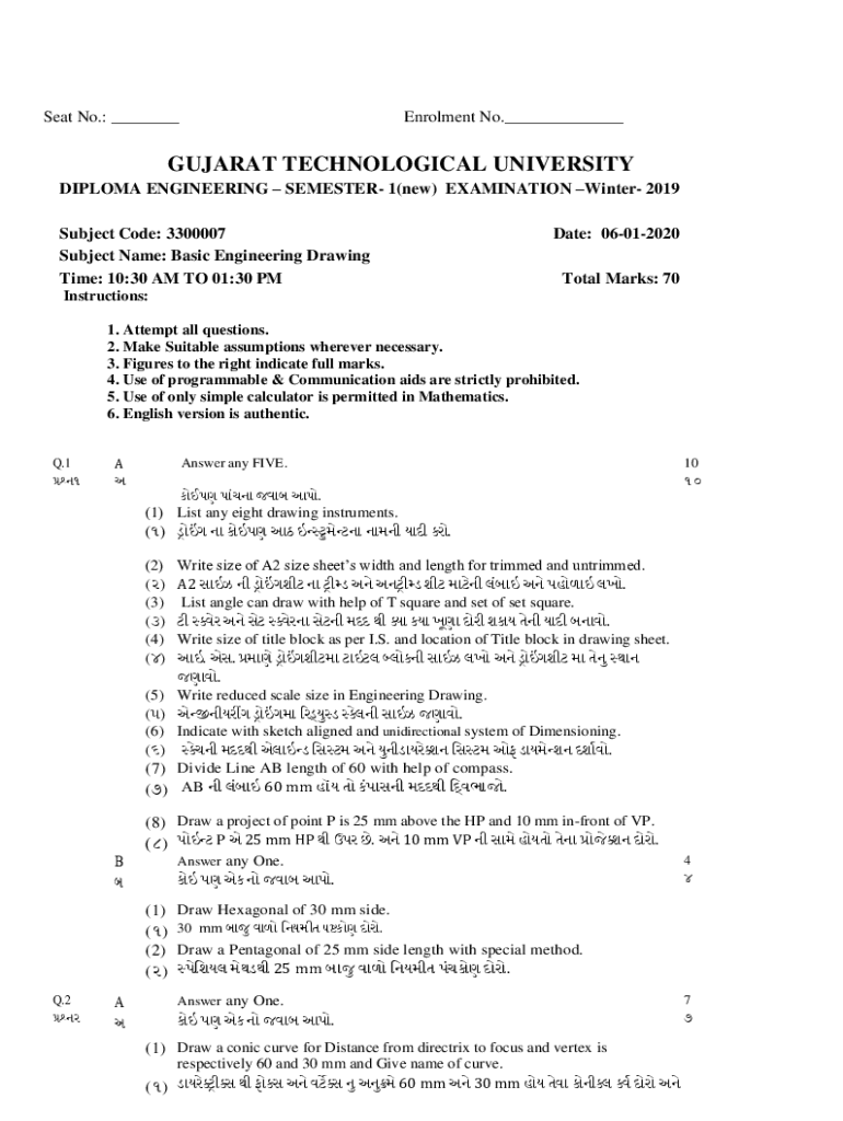 Seat No.: ___Enrolment No.___GUJARAT TECHNOLOGICAL UNIVERSITY DIPLOMA ENGINEERING SEMESTER 1(new) EXAMINATION Winter 2019 Subject Code: 3300007 Subject Name: Basic Engineering Drawing Time: 10:30