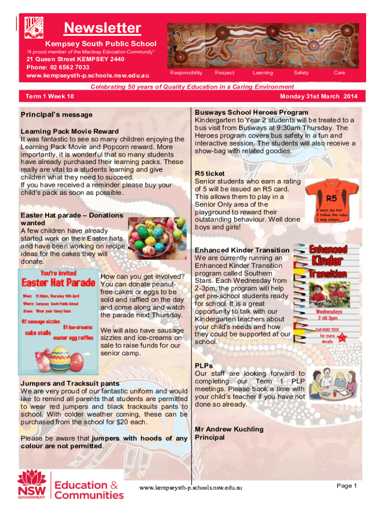 NewsletterTerm 1 Week 10Monday 31st March 2014Kempsey South Public School