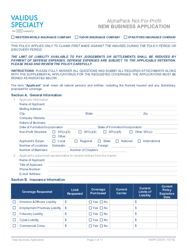 AlphaPack NotForProfit NEW BUSINESS APPLICATION WESTERN WORLD INSURANCE COMPANYTUDOR INSURANCE COMPANYSTRATFORD INSURANCE COMPANYTHIS POLICY APPLIES ONLY TO CLAIMS FIRST MADE AGAINST THE INSURED DURING