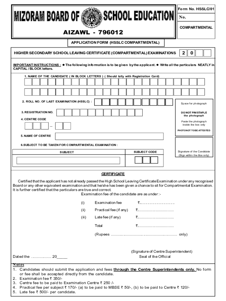 Form No. HSSLC/01No. COMPARTMENTALAIZAWL 796012 APPLICATION FORM (HSSLC COMPARTMENTAL) HIGHER SECONDARY SCHOOL LEAVING CERTIFICATE (COMPARTMENTAL) EXAMINATIONS20IMPORTANT INSTRUCTIONS : The following