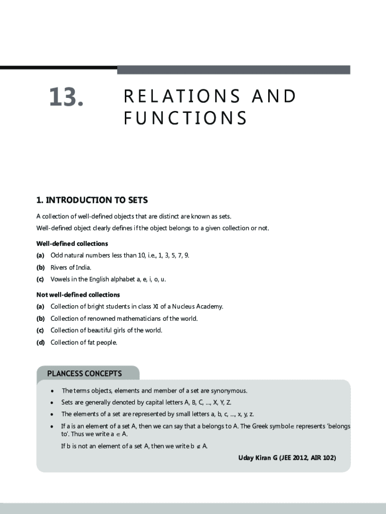 13.R E L AT I O N S A N D FUNCTIONS1. INTRODUCTION TO SETS A collection of welldefined objects that are distinct are known as sets. Welldefined object clearly defines if the object belongs to a given