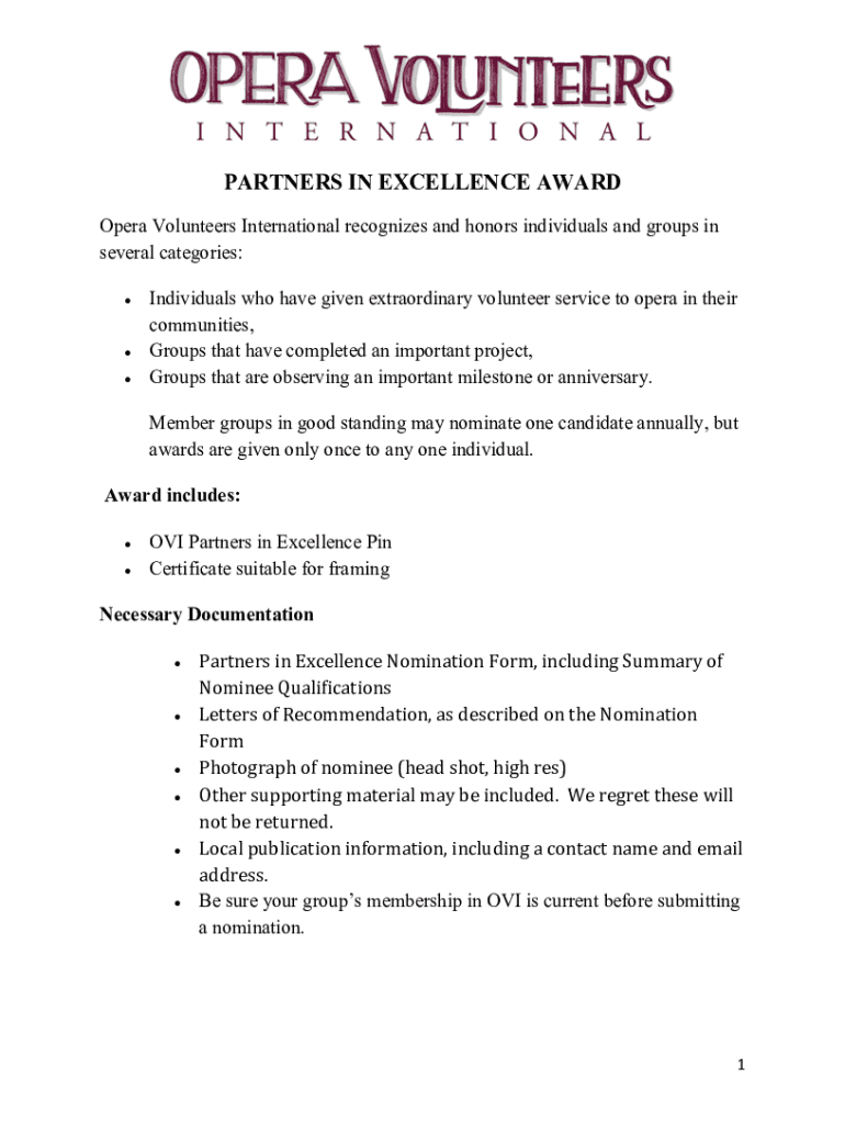 Get the free Necessary Documentation for Partners in Excellence Nominations
