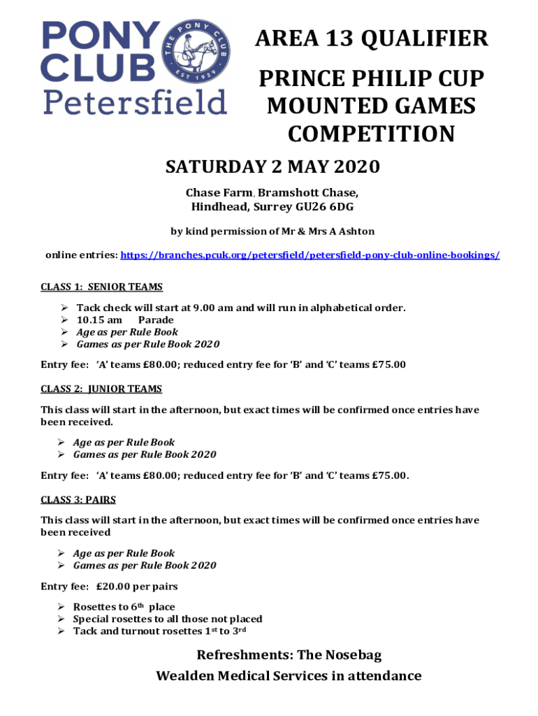 AREA 13 QUALIFIER PRINCE PHILIP CUP MOUNTED GAMES COMPETITION SATURDAY 2 MAY 2020 Chase Farm, Bramshott Chase, Hindhead, Surrey GU26 6DG by kind permission of Mr & Mrs A Ashton online entries: https://branches.pcuk.org/petersfield/petersfieldponyclubonlinebookings/