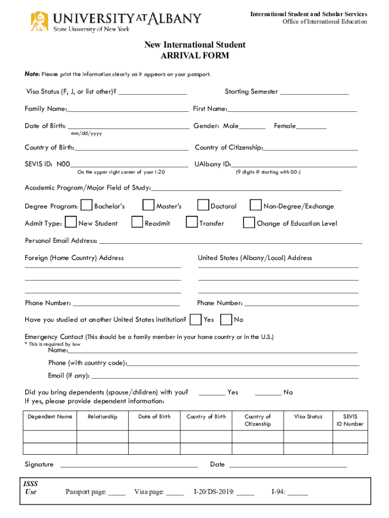 International Student and Scholar Services Office of International EducationNew International Student ARRIVAL FORM Note: Please print the information clearly as it appears on your passport.Visa Status