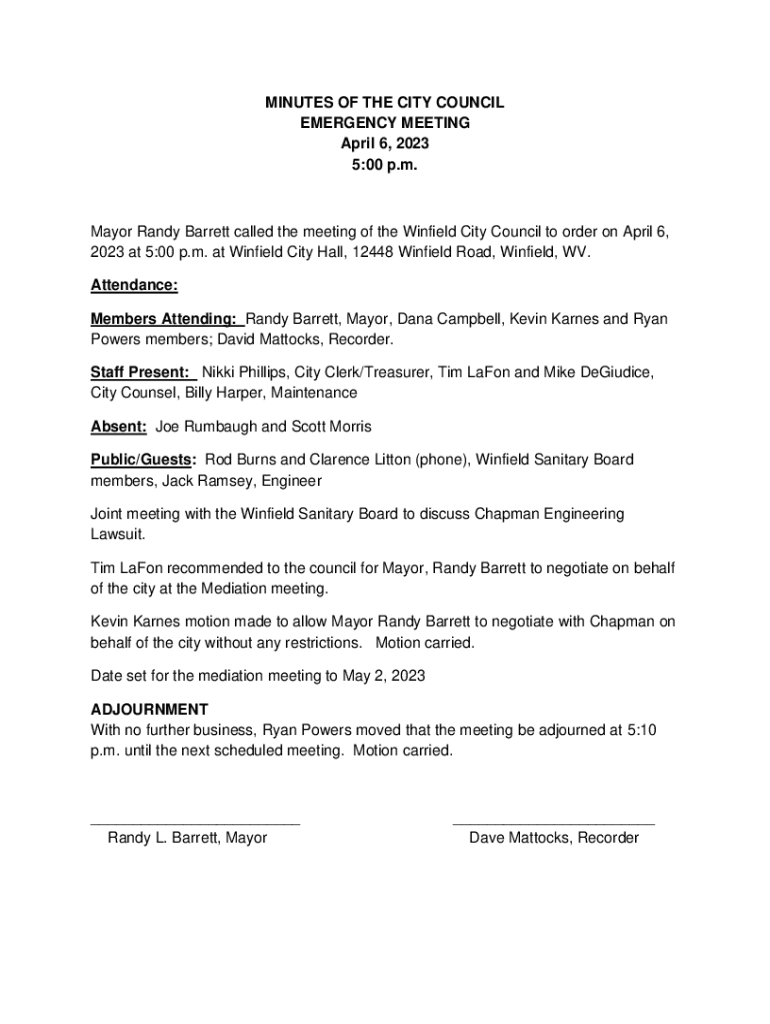 MINUTES OF THE CITY COUNCIL EMERGENCY MEETING April 6, 2023 5:00 p.m.Mayor Randy Barrett called the meeting of the Winfield City Council to order on April 6, 2023 at 5:00 p.m. at Winfield City Hall,