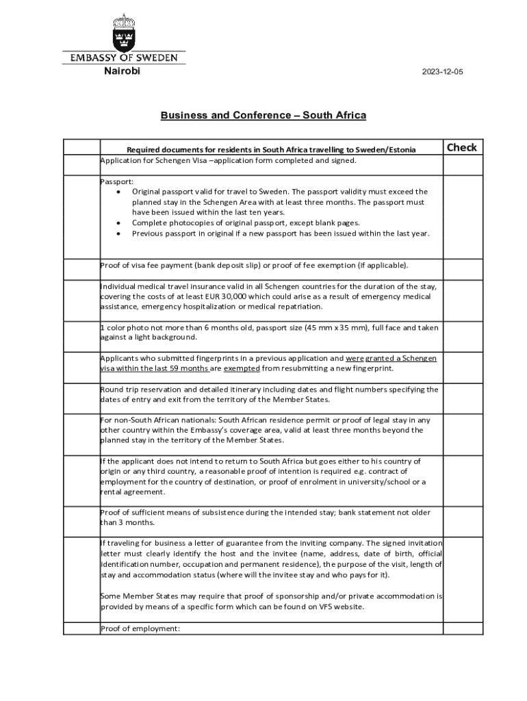 Nairobi20231205Business and Conference South Africa Required documents for residents in South Africa travelling to Sweden/Estonia Application for Schengen Visa application form completed and signed.