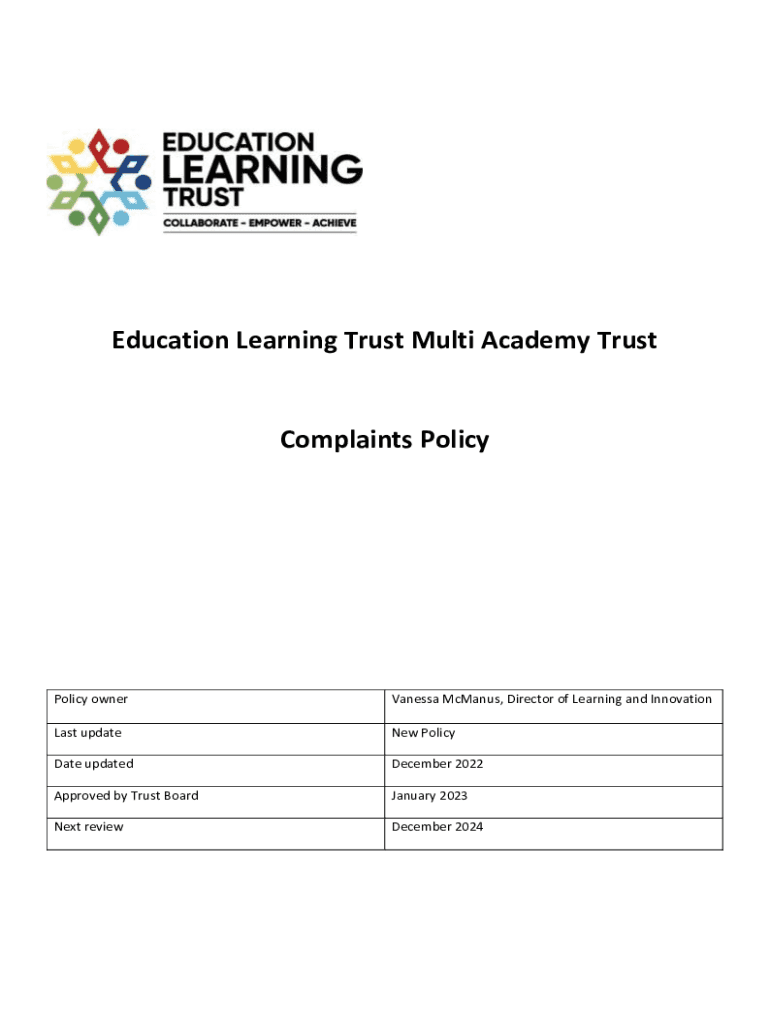 Education Learning Trust Multi Academy TrustComplaints PolicyPolicy ownerVanessa McManus, Director of Learning and InnovationLast updateNew PolicyDate updatedDecember 2022Approved by Trust BoardJanuary
