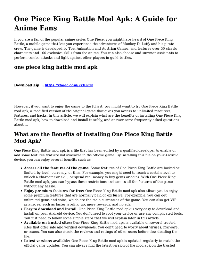 One Piece King Battle Mod APK: A Guide for Anime Fans If you are a fan of the popular anime series One Piece, you might have heard of One Piece King Battle, a mobile game that lets you experience