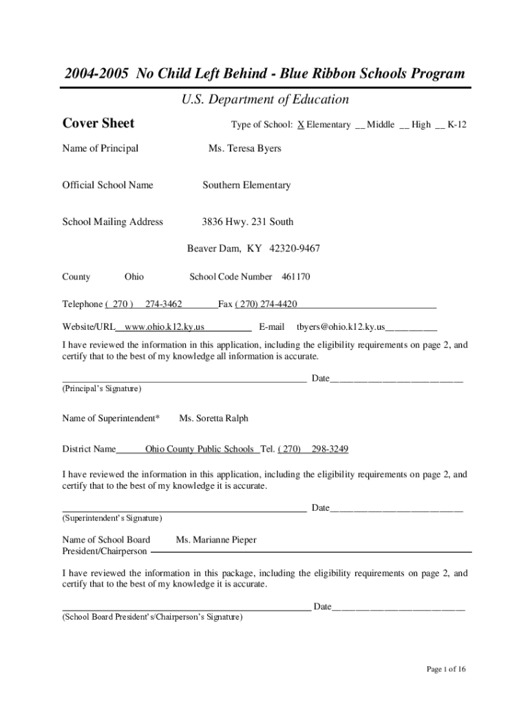 Cover Phenotype of School: X Elementary __ Middle __ High __ K12Name of Principals. Teresa ByersOfficial School