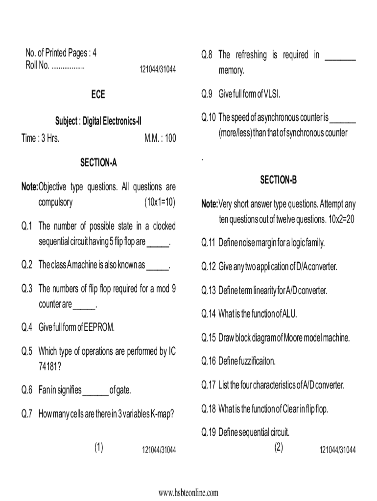 No. of Printed Pages : 4 Roll No. ..................121044/31044Q.9 Give full form of VLSI.ECE Subject : Digital ElectronicsII Time : 3 Hrs.Q.8 The refreshing is required in ___ memory.M.M. : 100Q.10