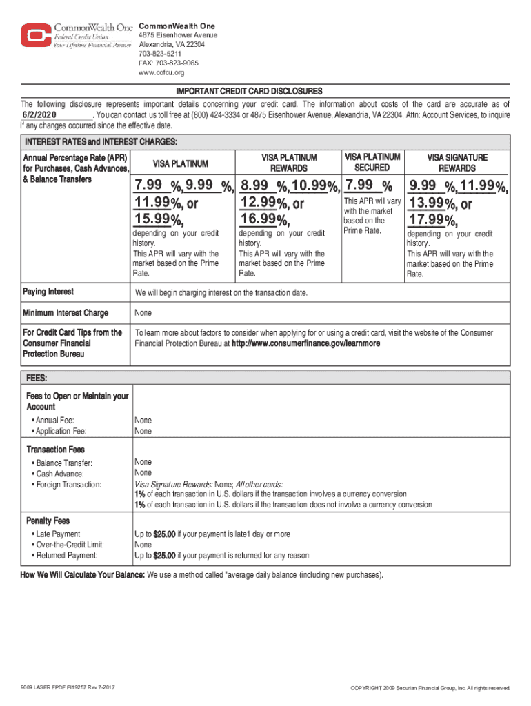 CommonWealth One 4875 Eisenhower Avenue Alexandria, VA 22304 7038235211 FAX: 7038239065 www.cofcu.orgIMPORTANT CREDIT CARD DISCLOSURES The following disclosure represents important details concerning