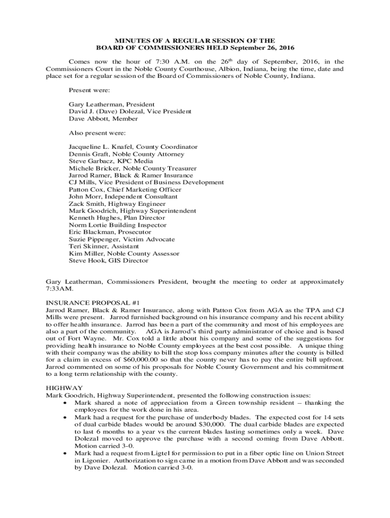 BOARD OF COMMISSIONERS HELD September 26, 2016,