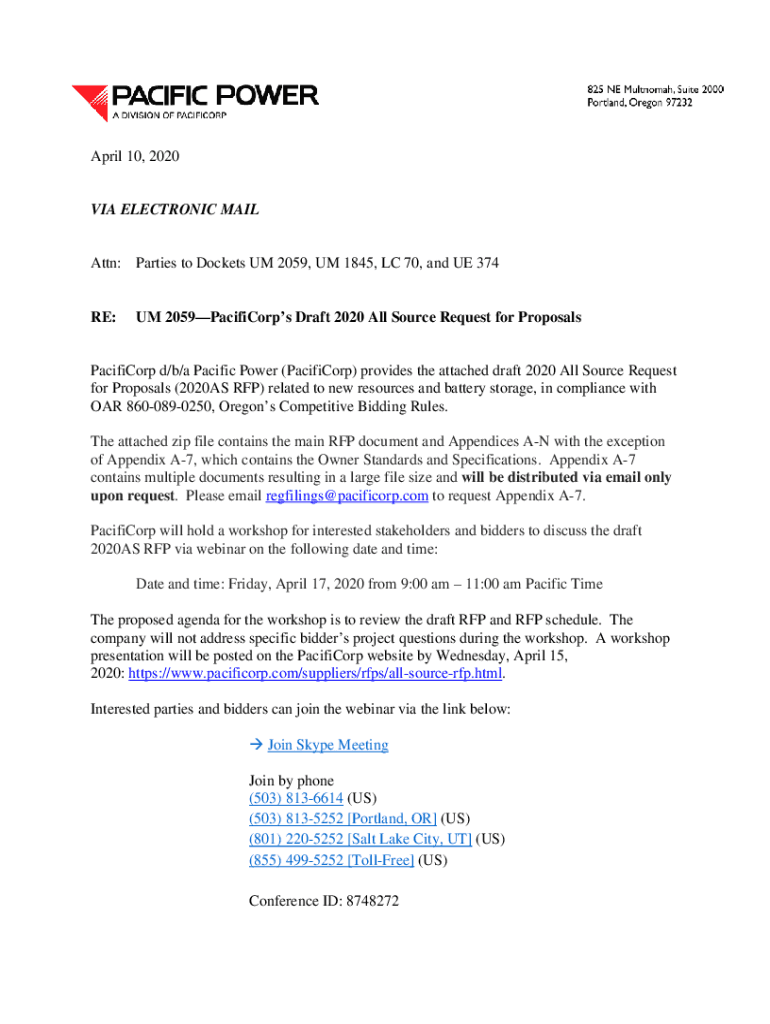 April 10, 2020VIA ELECTRONIC MAILAttn: Parties to Dockets UM 2059, UM 1845, LC 70, and UE 374RE:UM 2059PacifiCorps Draft 2020 All Source Request for ProposalsPacifiCorp d/b/a Pacific Power (PacifiCorp)