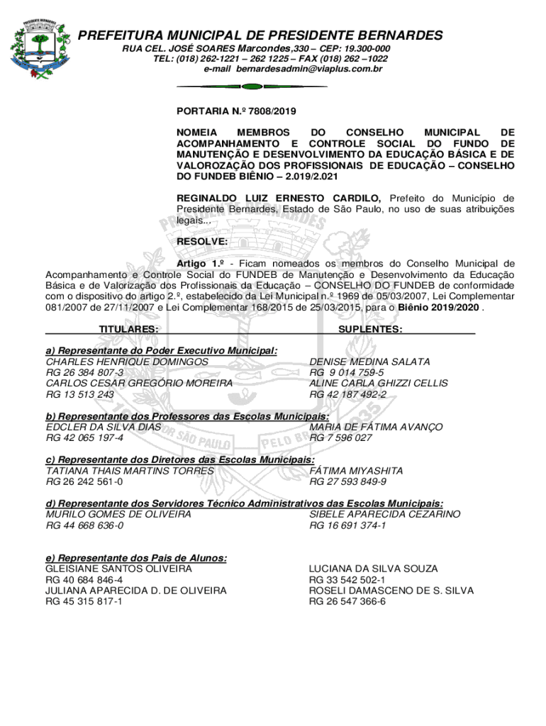 PREFEITURA MUNICIPAL DE PRESIDENTE BERNARDES RUA CEL. JOS SOARES Marcondes,330 CEP: 19.300000 TEL: (018) 2621221 262 1225 FAX (018) 262 1022 email bernardesadmin@viaplus.com.brPORTARIA N. 7808/2019