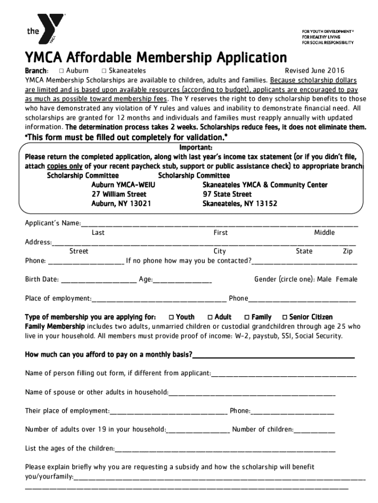 YMCA Affordable Membership Application Branch: Auburn Skaneateles Revised June 2016 YMCA Membership Scholarships are available to children, adults and families. Because scholarship dollars are limited