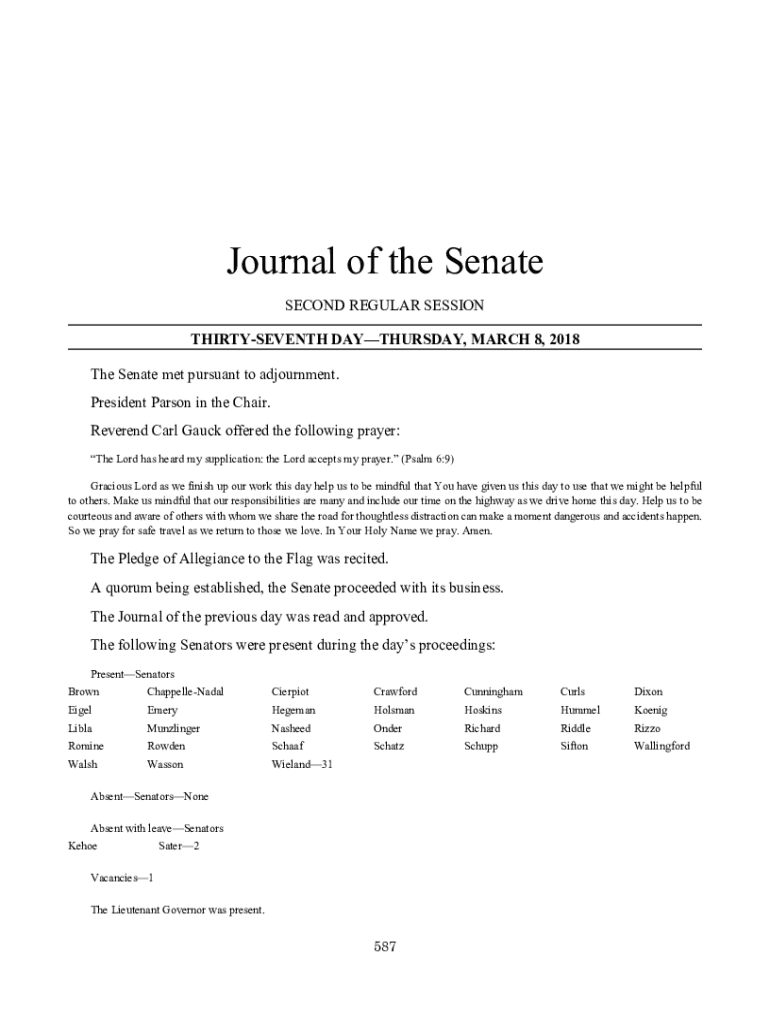 Journal of the Senate SECOND REGULAR SESSION THIRTYSEVENTH DAYTHURSDAY, MARCH 8, 2018 The Senate met pursuant to adjournment. President Parson in the Chair. Reverend Carl Gauck offered the following