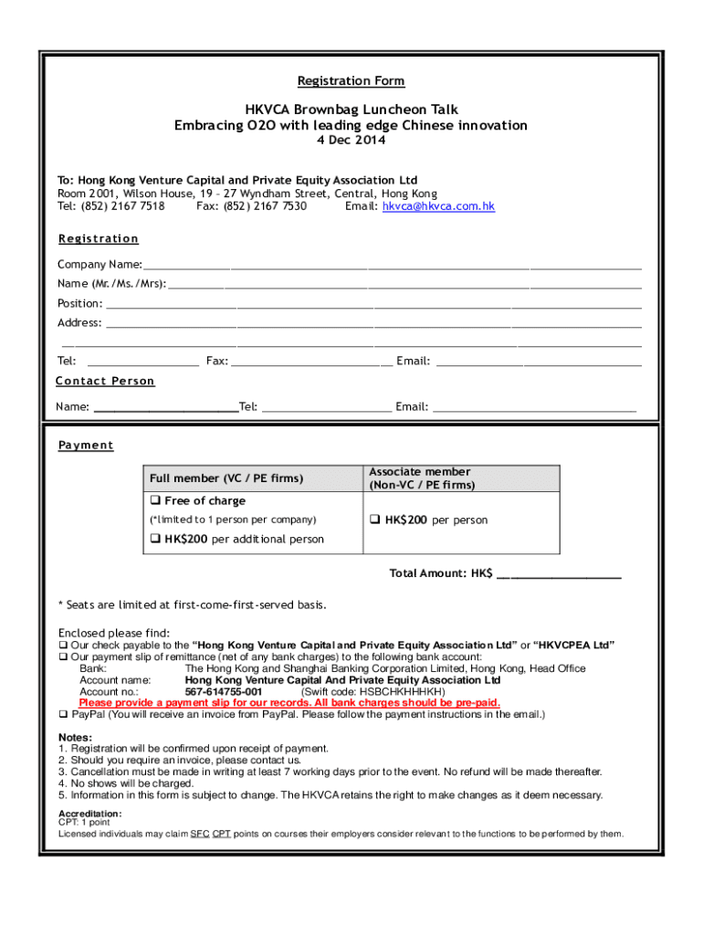 Registration FormHKVCA Brownbag Luncheon Talk Embracing O2O with leading edge Chinese innovation 4 Dec 2014 To: Hong Kong Venture Capital and Private Equity Association Ltd Room 2001, Wilson House,