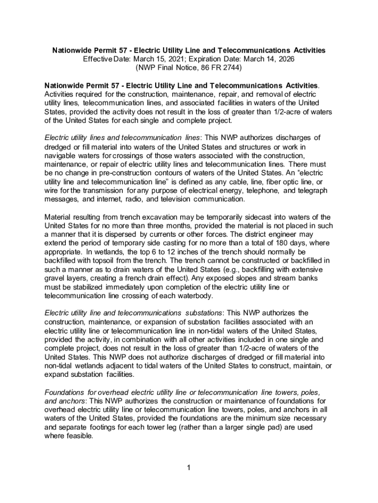 Nationwide Permit 57 Electric Utility Line and Telecommunications Activities Effective Date: March 15, 2021; Expiration Date: March 14, 2026 (NWP Final Notice, 86 FR 2744) Nationwide Permit 57 Electric