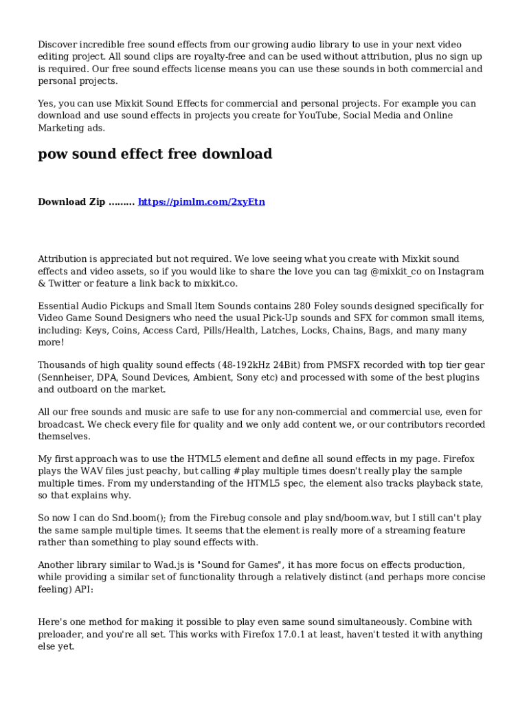 Filling out the pow sound effect download usually involves selecting the desired format, agreeing to licensing terms, and providing necessary information such as the intended use and the number of downloads.