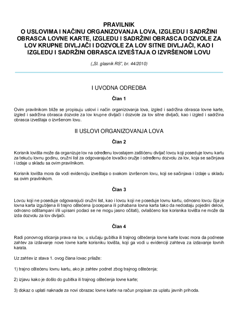 PRAVILNIK O USLOVIMA I NAINU ORGANIZOVANJA LOVA, IZGLEDU I SADRINI OBRASCA LOVNE KARTE, IZGLEDU I SADRINI OBRASCA DOZVOLE ZA LOV KRUPNE DIVLJAI I DOZVOLE ZA LOV SITNE DIVLJAI, KAO I IZGLEDU I SADRINI