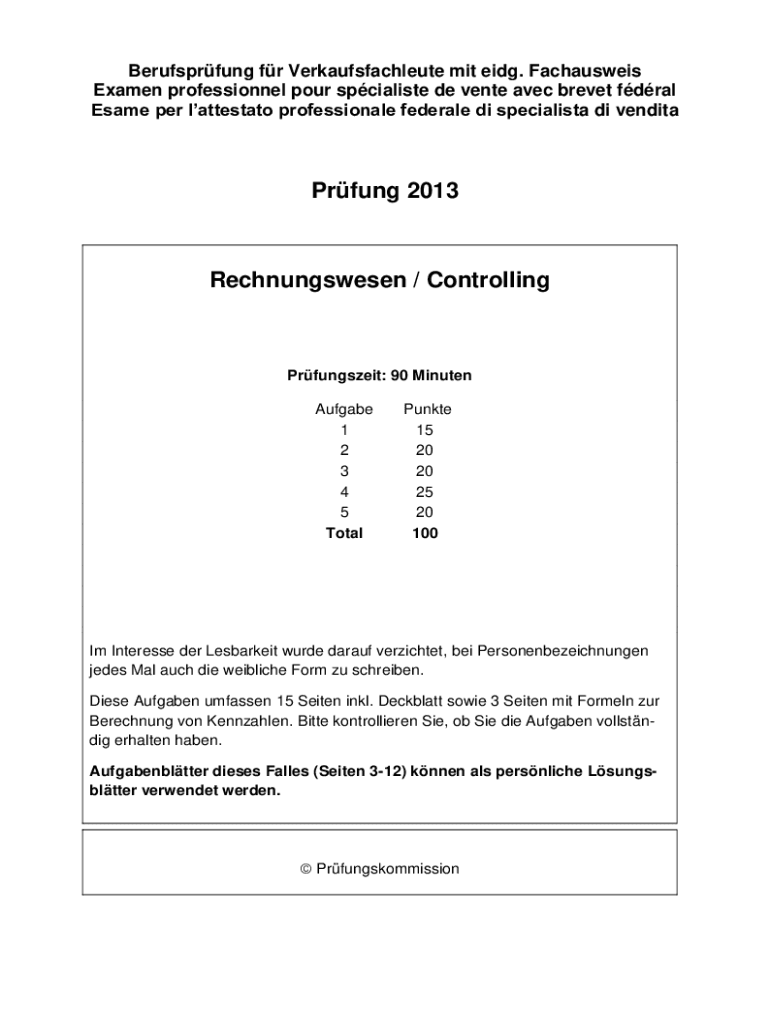 Berufsprfung fr Verkaufsfachleute mit eidg. Fachausweis Examen professionnel pour spcialiste de vente avec brevet fdral Esame per lattestato professionale federale di specialista di venditaPrfung