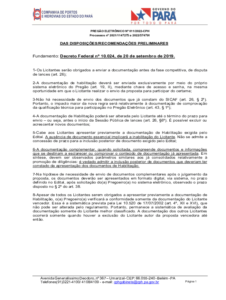 PREGO ELETRNICO N 011/2022CPH Processos n 2021/1147275 e 2022/574791DAS DISPOSIES/RECOMENDAES PRELIMINARESFundamento: Decreto Federal n 10.024, de 20 de setembro de 2019. 1Os Licitantes sero obrigados