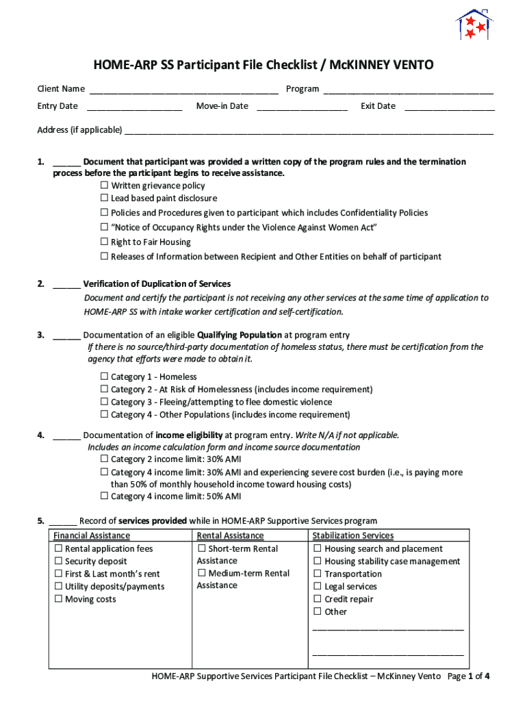 HOMEARP SS Participant File Checklist / McKINNEY VENTO Client Name ___ Program ___ Entry Date ___Movein Date ___Exit Date ___Address (if applicable) ___ 1. ___ Document that participant was provided