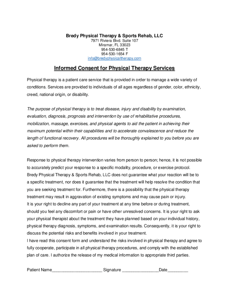 Bredy Physical Therapy & Sports Rehab, LLC 7971 Riviera Blvd. Suite 107 Miramar, FL 33023 9545306845 T 9545301654 F info@bredyphysicaltherapy.comInformed Consent for Physical Therapy Services Physical