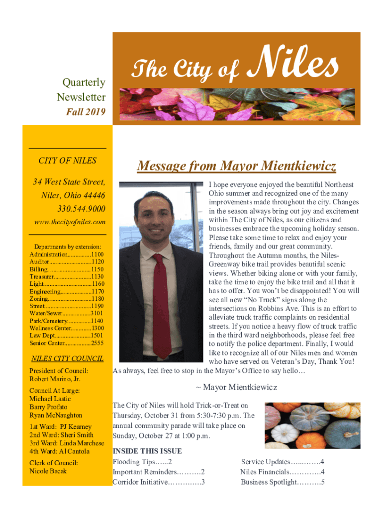 Newsletter City ofNilesFall 2019CITY OF NILESMessage from Mayor Mientkiewicz34 West State Street, I hope everyone enjoyed the beautiful Northeast