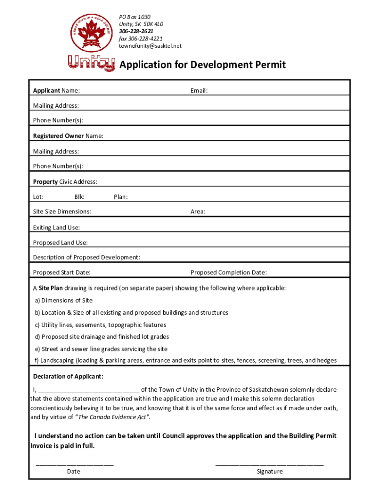 PO Box 1030 Unity, SK S0K 4L0 3062282621 fax 3062284221 townofunity@sasktel.netApplication for Development Permit Applicant Name:Email:Mailing Address: Phone Number(s): Registered Owner Name: Mailing